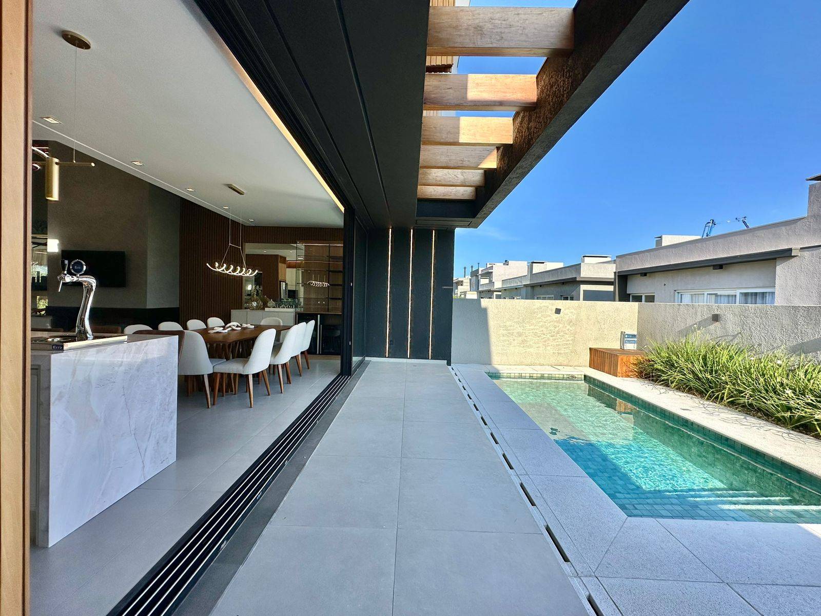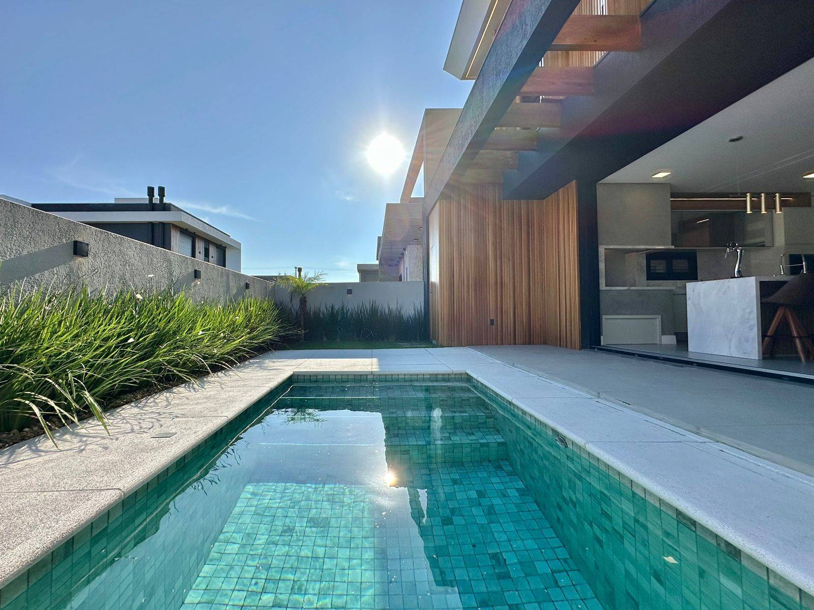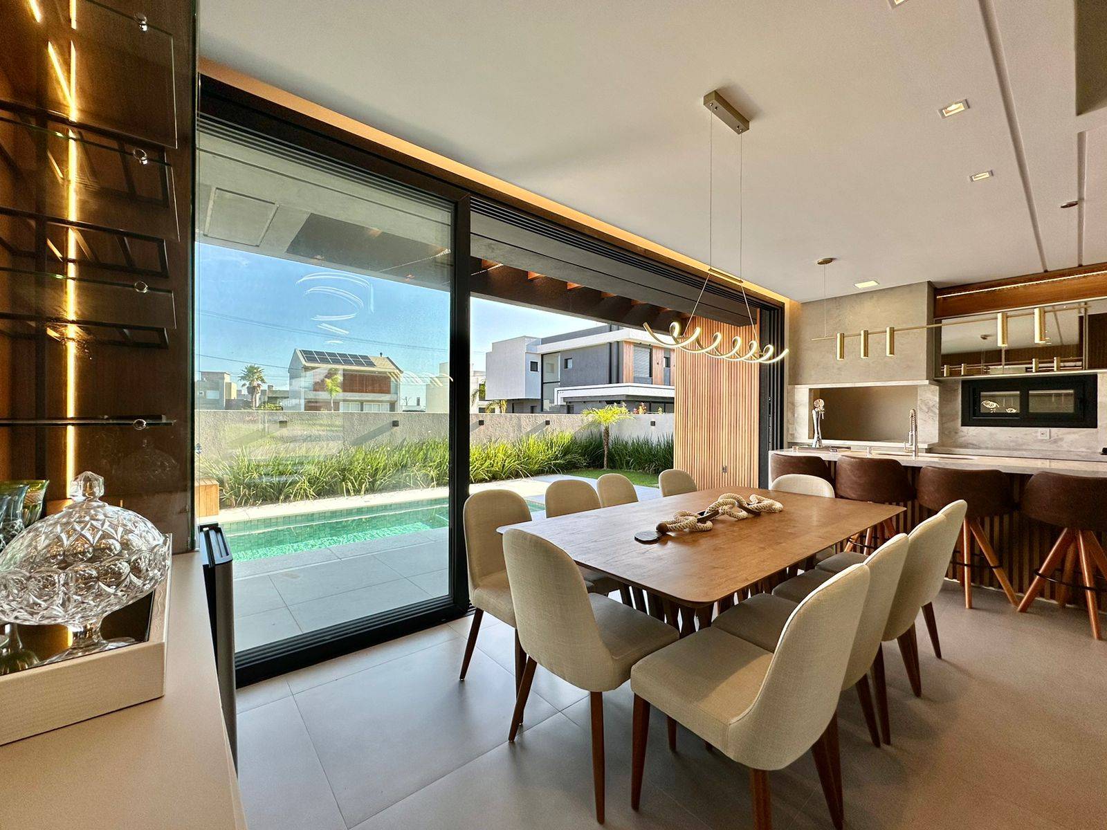 Incrível sobrado com excelente padrão construtivo à venda no Condomínio Sunset em Xangri-Lá. Altíssimo padrão construtivo, excelente localização, com 241m² privativos, com 04 suítes (1master e 1 térrea). Living com 03 ambientes, pé-direito duplo, lareira, lavabo, cozinha americana, espaço gourmet com churrasqueira, área de serviço, home office, piscina e vaga para carro!