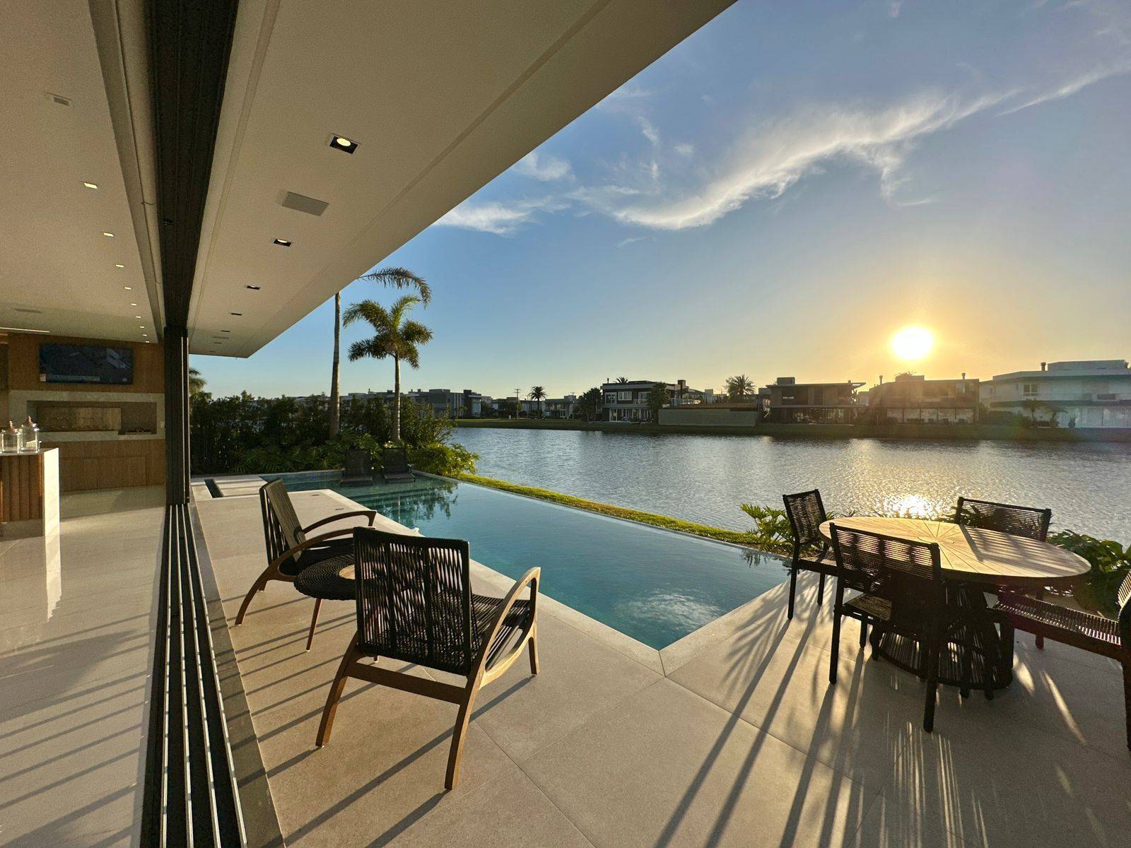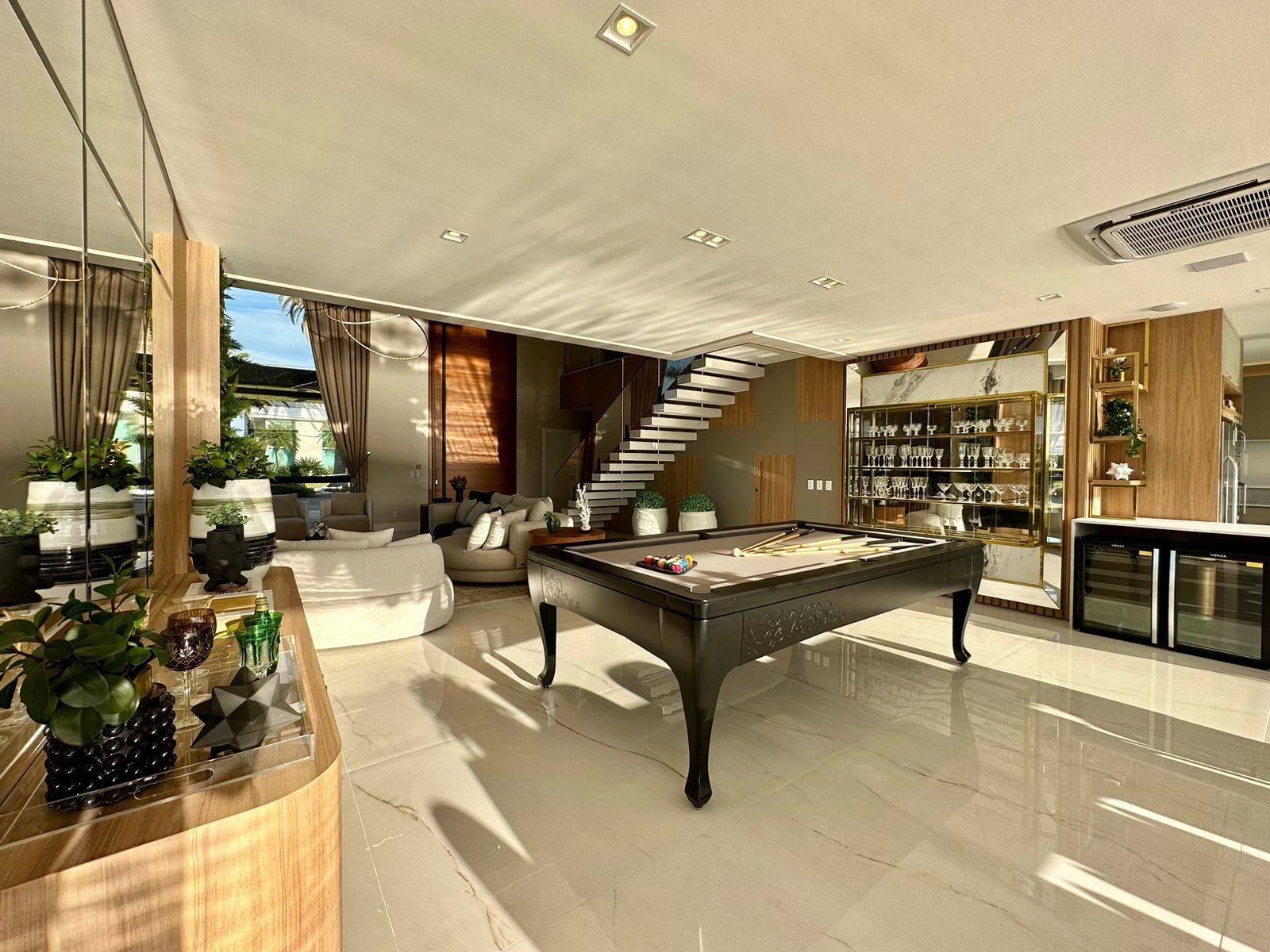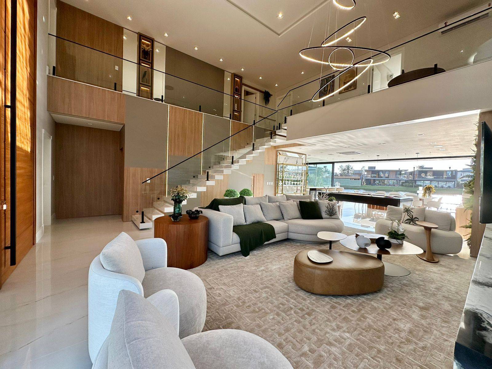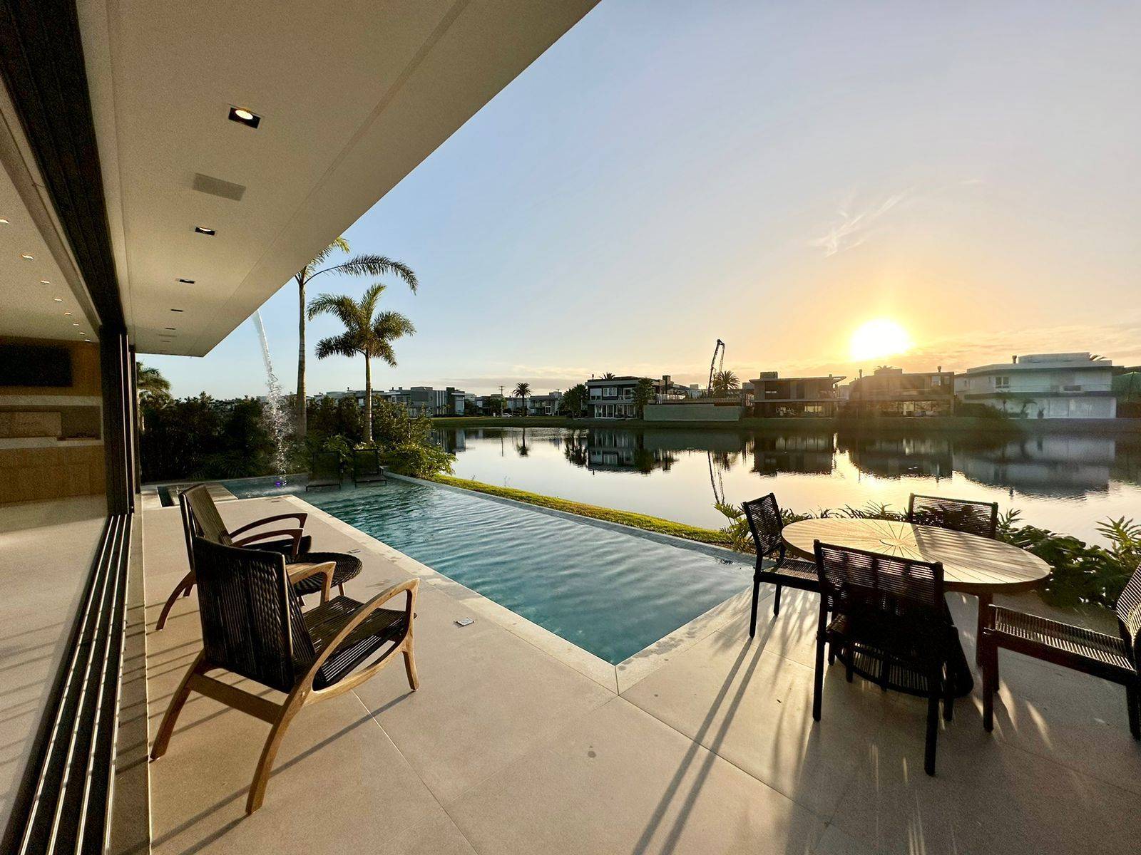 Sobrado no condomínio fechado Enseada lagos, com 426m² de área, 5 suítes (máster e térrea), lavabo, piscina de concreto com borda infinita e cascata, sala de jantar, sala de estar, espera para sistema fotovoltaico, jardim com irrigação automatizada, dependência de empregada, cinema, kids ou home office, abrigo para 2 carros, gourmet integrado a área de lazer, espera para automação, depósito externo fechado, espera para elevador, posição solar e localização privilegiada. Previsão de entrega outubro 2022, sendo Mobiliada e decorada.