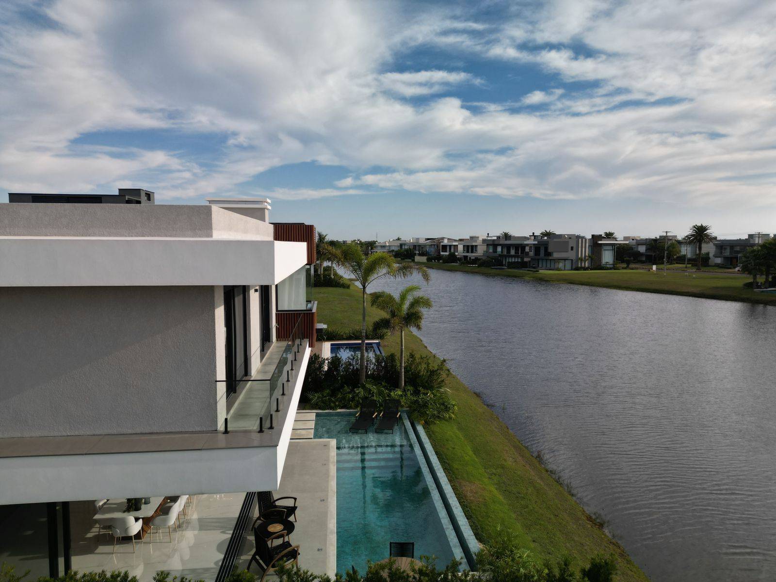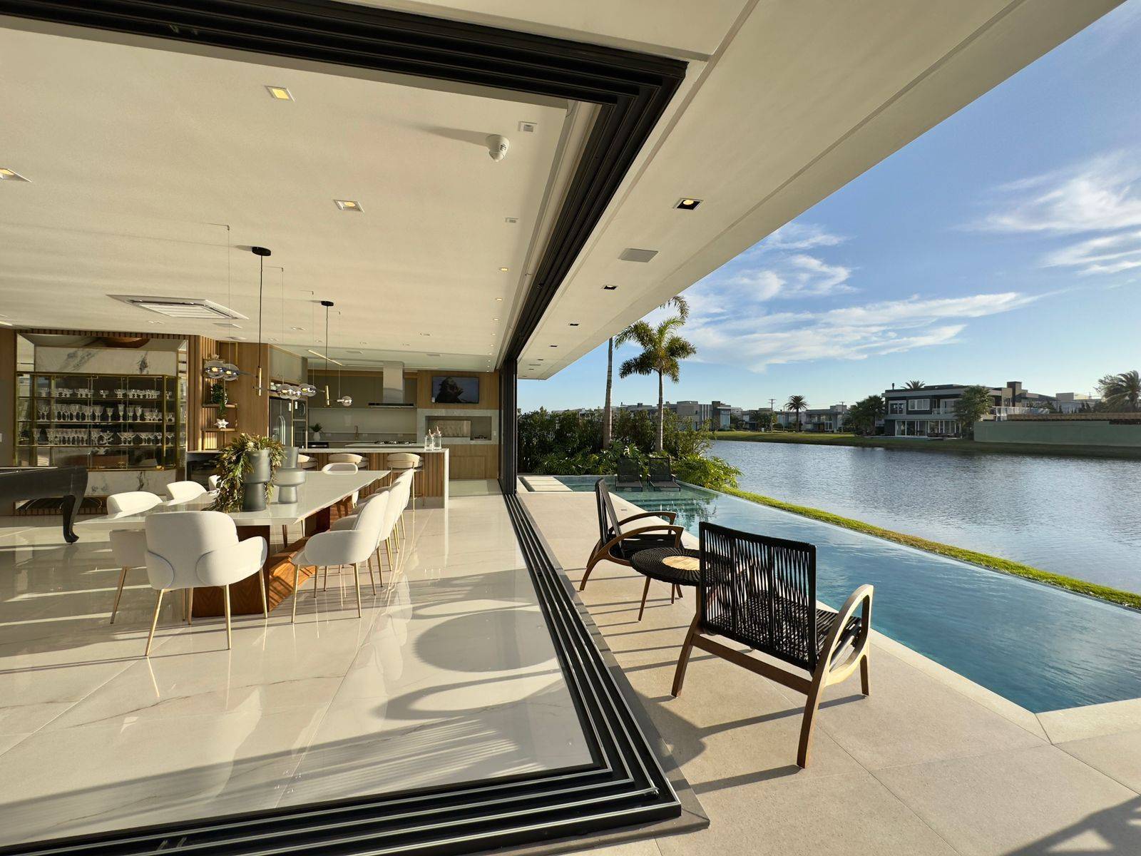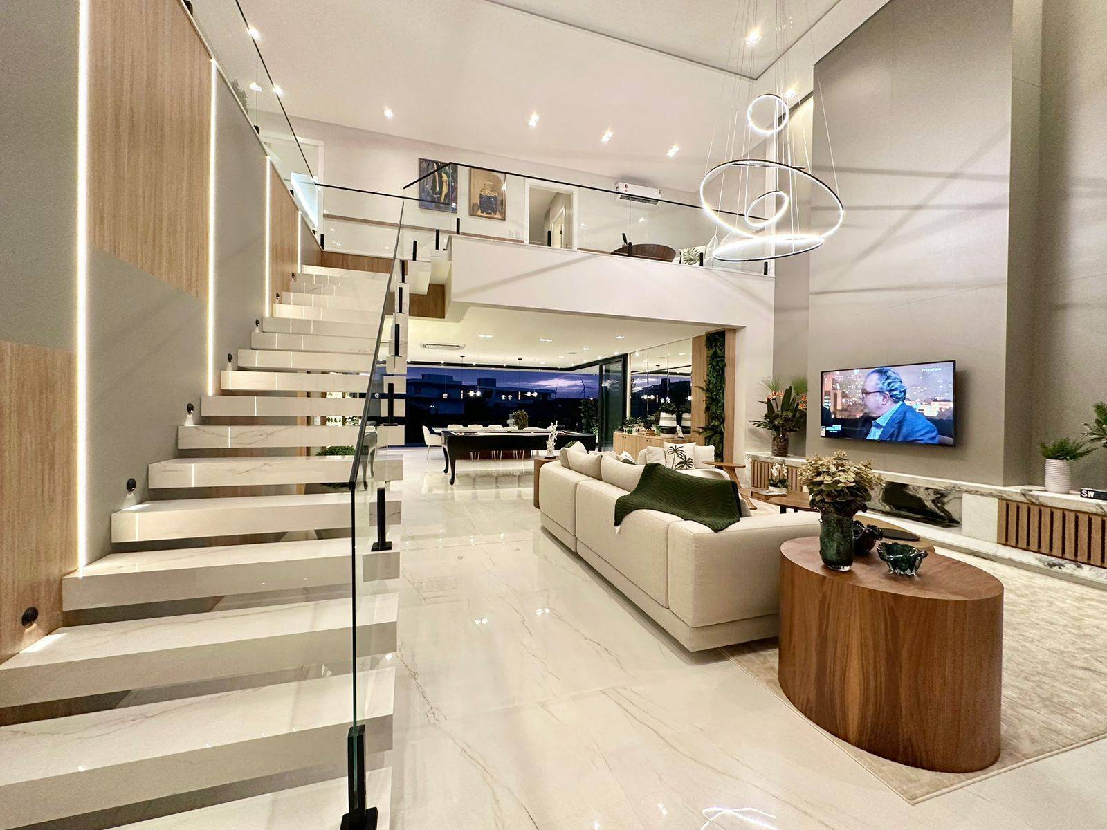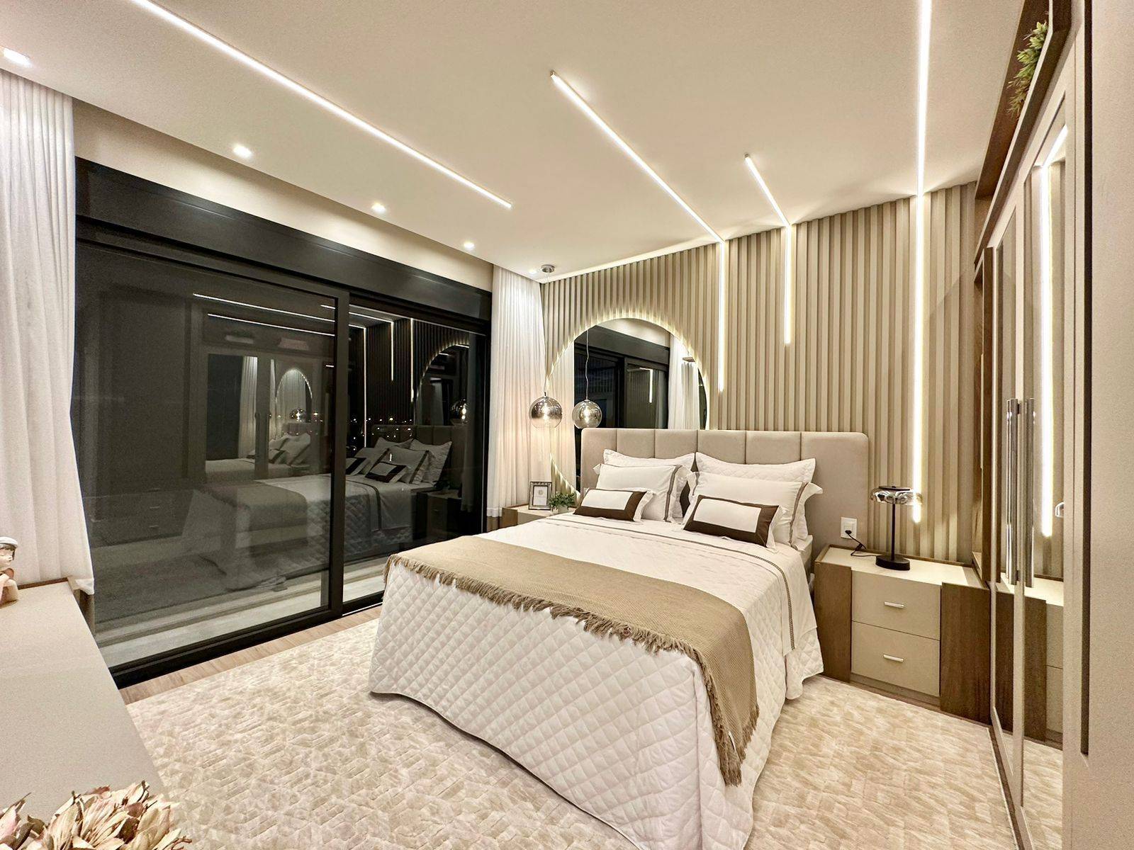 Sobrado no condomínio fechado Enseada lagos, com 426m² de área, 5 suítes (máster e térrea), lavabo, piscina de concreto com borda infinita e cascata, sala de jantar, sala de estar, espera para sistema fotovoltaico, jardim com irrigação automatizada, dependência de empregada, cinema, kids ou home office, abrigo para 2 carros, gourmet integrado a área de lazer, espera para automação, depósito externo fechado, espera para elevador, posição solar e localização privilegiada. Previsão de entrega outubro 2022, sendo Mobiliada e decorada.