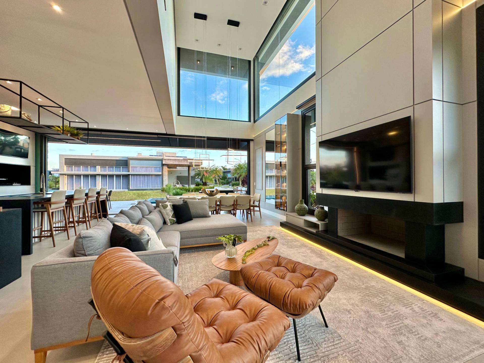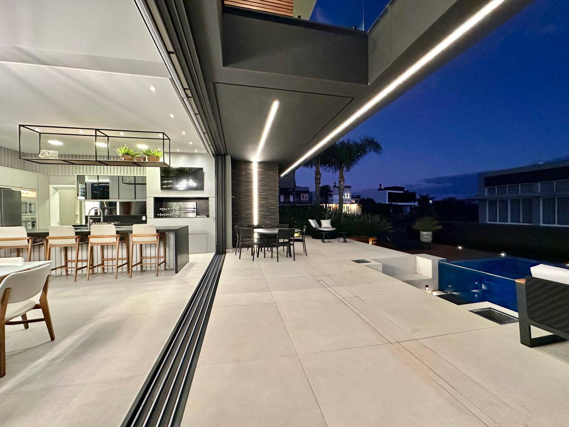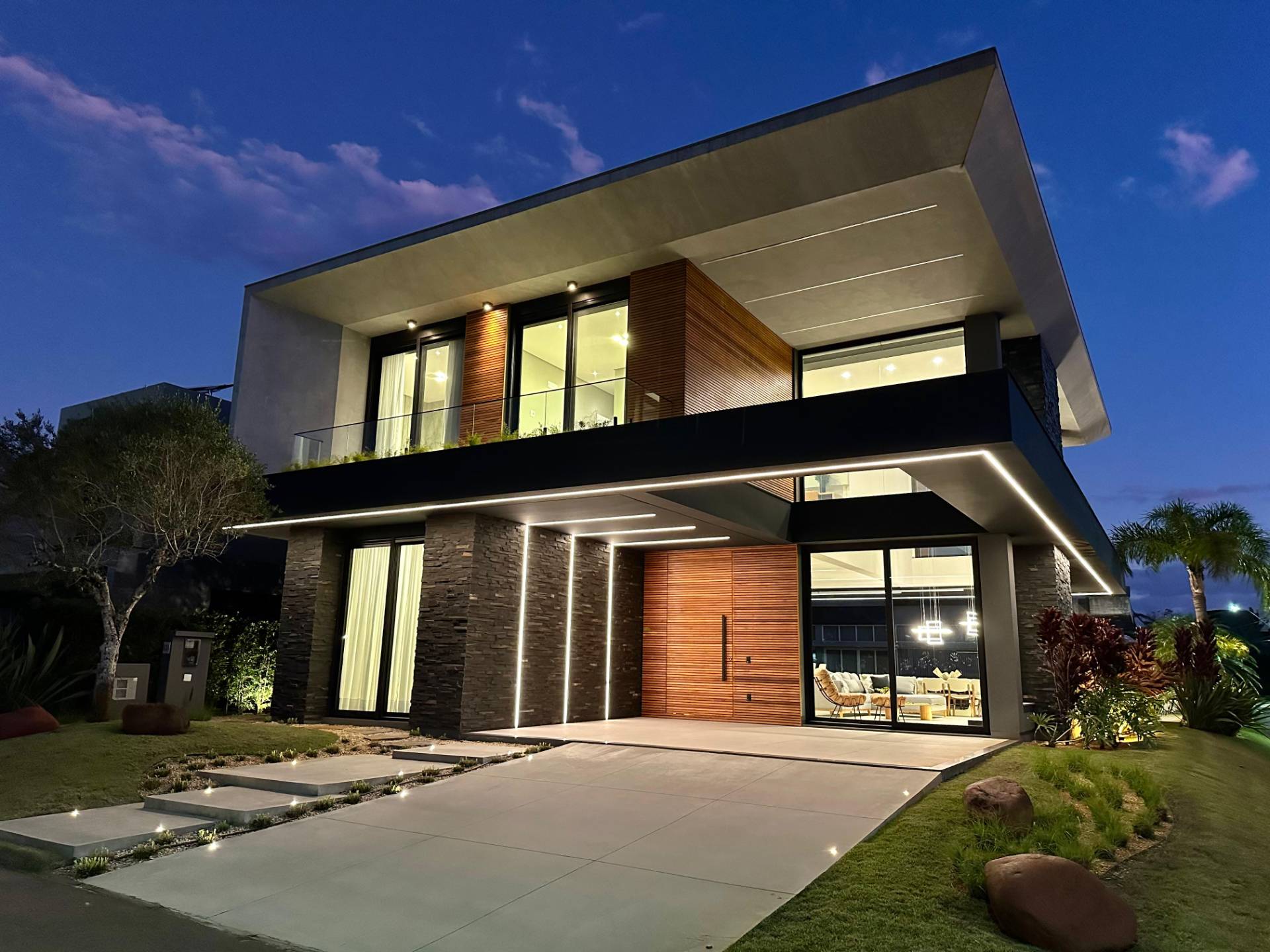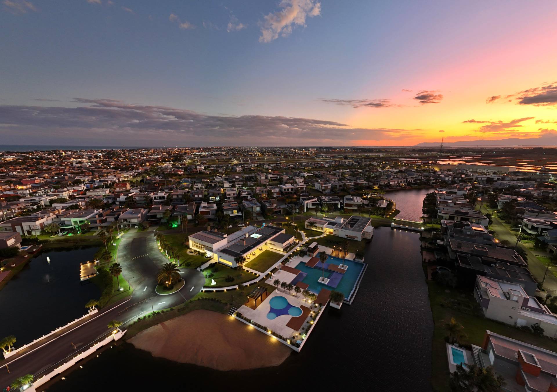 Magnifico sobrado em terreno de esquina com 5 suítes mais lavabo, living com pé direito alto, porta pivotante em madeira, sacadas no andar superior frente e fundos, lareira, churrasqueira, piscina, living integrando estar e jantar, cozinha estilo americana, iluminação em led, vaga coberta para 2 carros, piso porcelanato, espera para split e água quente, deck de madeira e ajardinamento. Condomínio inspirado nas praias dos astros de cinema. Veranear ou viver aqui é se transportar para um mundo a parte. O condomínio conta com fitness center completo, salão de festas equipado, espaço gourmet com churrasqueira e forno de pizzas, piscina adulto com 630m² com raias semi olimpicas, piscina infantil, quadra de tênis de piso rápido aberta, quadra poliesportiva aberta, quadra de tênis de saibro e poliesportiva cobertas, quadra de beach vôlei, ilha com pergolado e espaço zen, quiosque com conveniência e churrasqueira, cancha de bocha e clube de praia. O que está esperando? Vamos conhecer este que imóvel e torná-lo seu recanto de lazer!