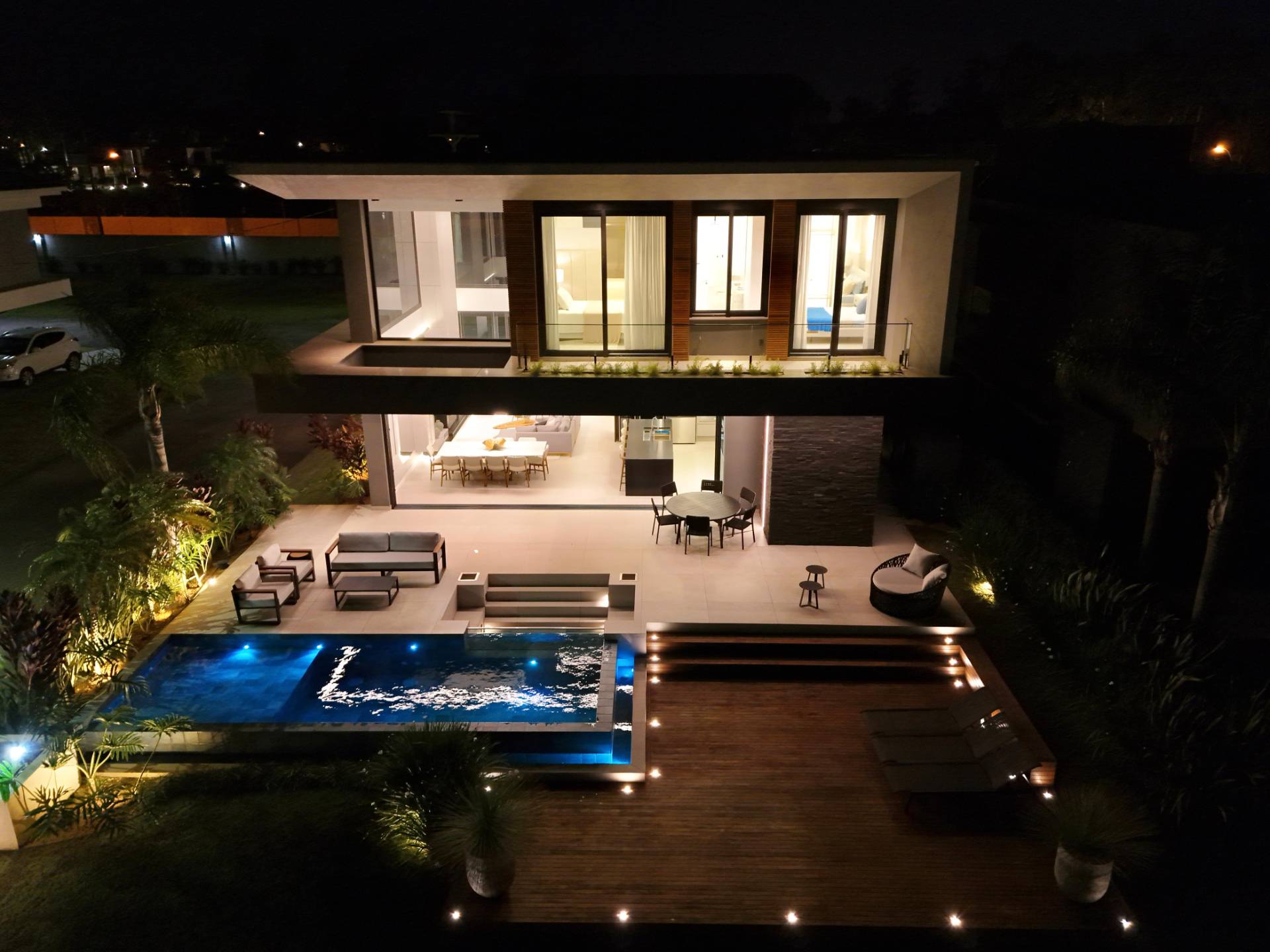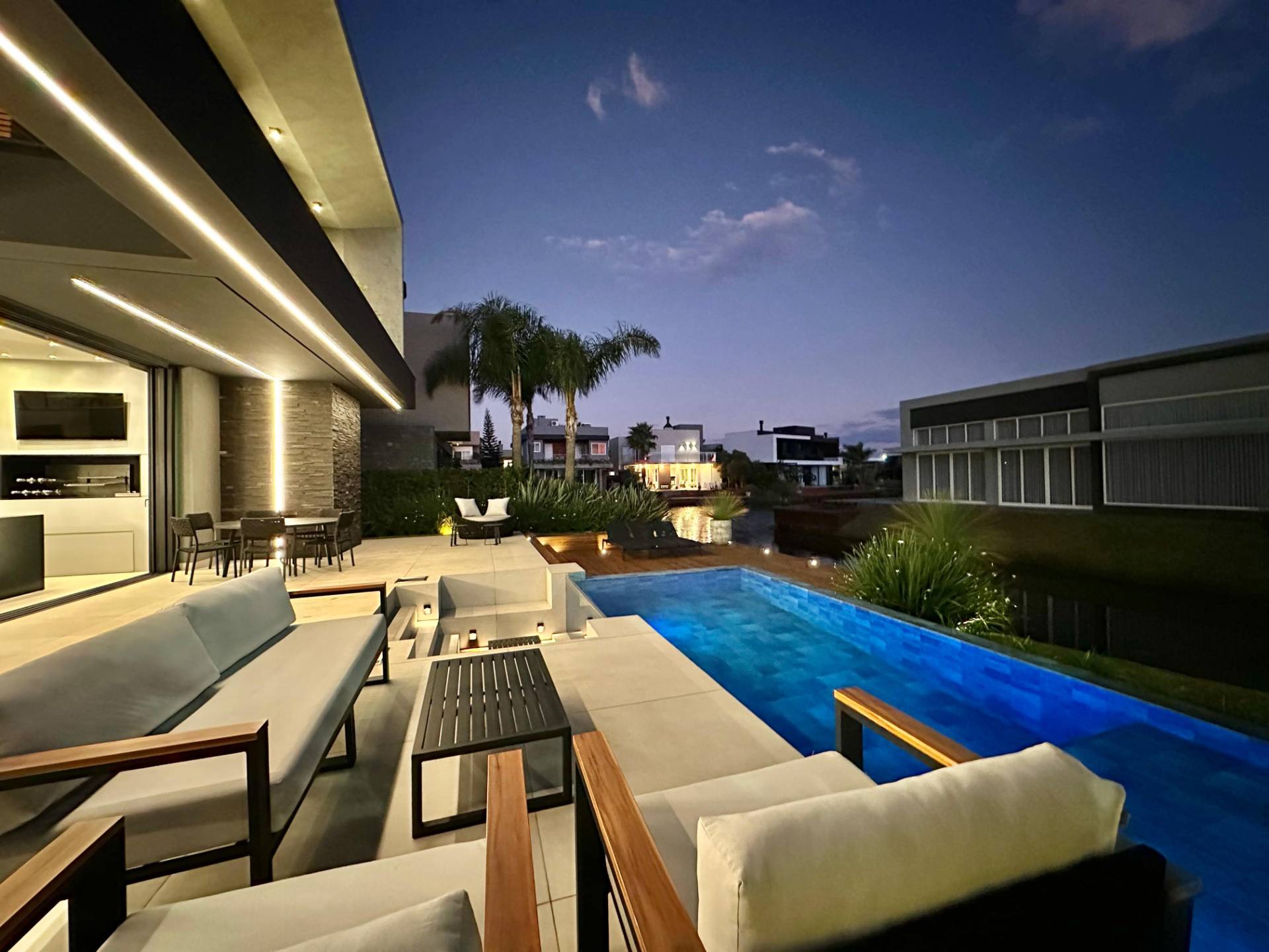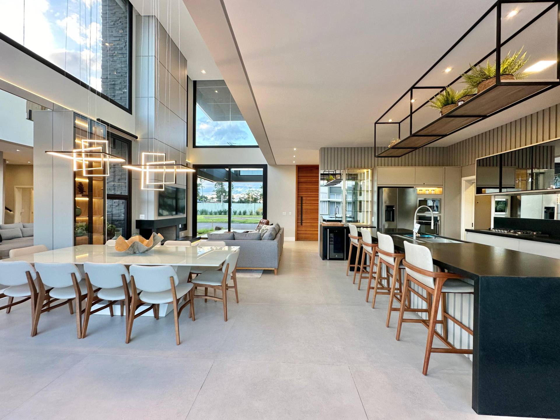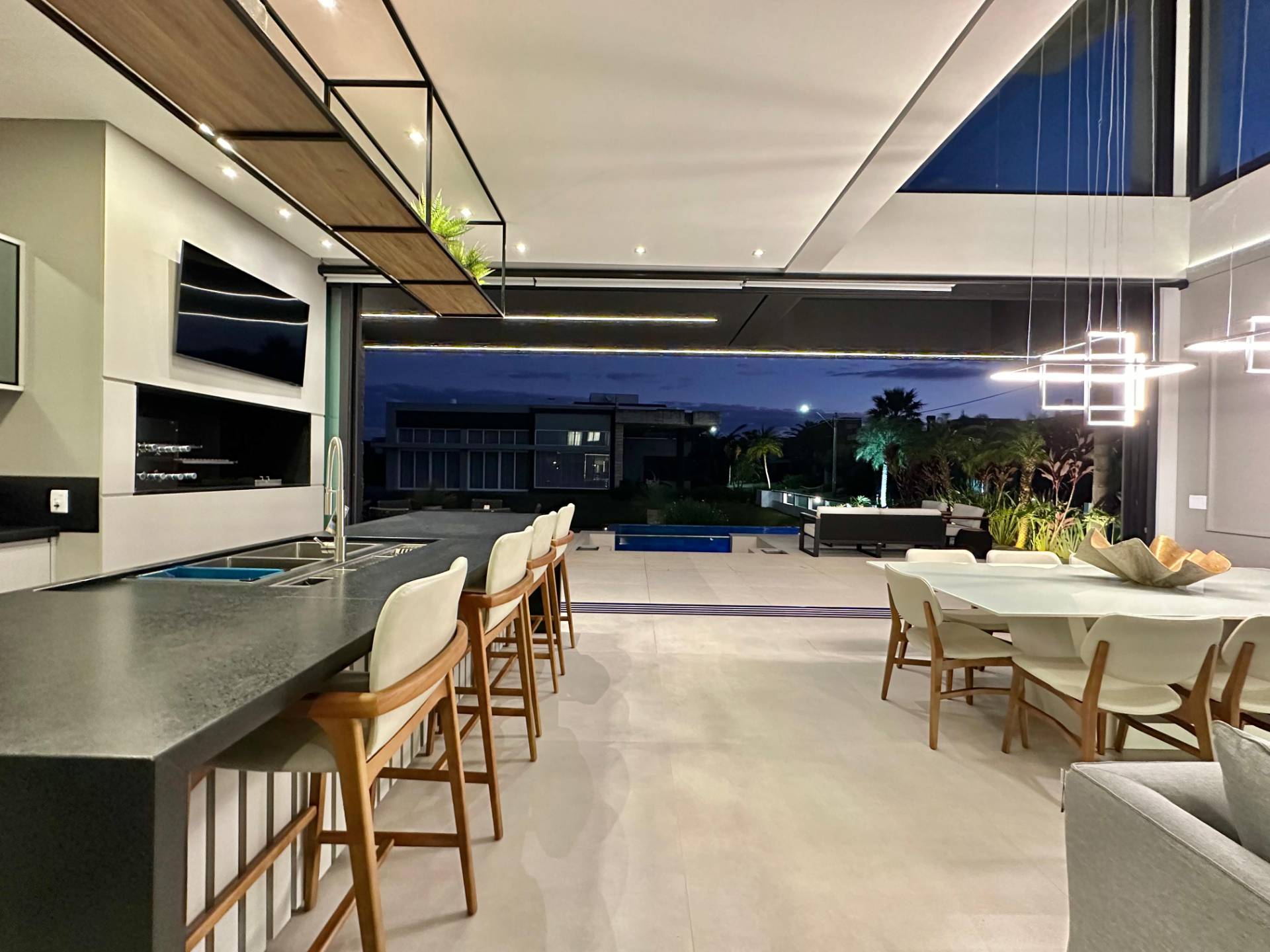 Magnifico sobrado em terreno de esquina com 5 suítes mais lavabo, living com pé direito alto, porta pivotante em madeira, sacadas no andar superior frente e fundos, lareira, churrasqueira, piscina, living integrando estar e jantar, cozinha estilo americana, iluminação em led, vaga coberta para 2 carros, piso porcelanato, espera para split e água quente, deck de madeira e ajardinamento. Condomínio inspirado nas praias dos astros de cinema. Veranear ou viver aqui é se transportar para um mundo a parte. O condomínio conta com fitness center completo, salão de festas equipado, espaço gourmet com churrasqueira e forno de pizzas, piscina adulto com 630m² com raias semi olimpicas, piscina infantil, quadra de tênis de piso rápido aberta, quadra poliesportiva aberta, quadra de tênis de saibro e poliesportiva cobertas, quadra de beach vôlei, ilha com pergolado e espaço zen, quiosque com conveniência e churrasqueira, cancha de bocha e clube de praia. O que está esperando? Vamos conhecer este que imóvel e torná-lo seu recanto de lazer!